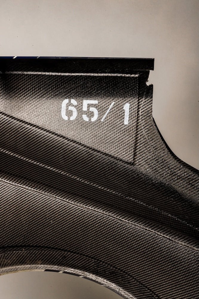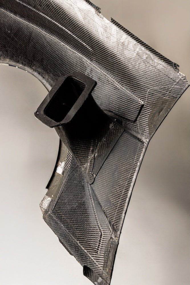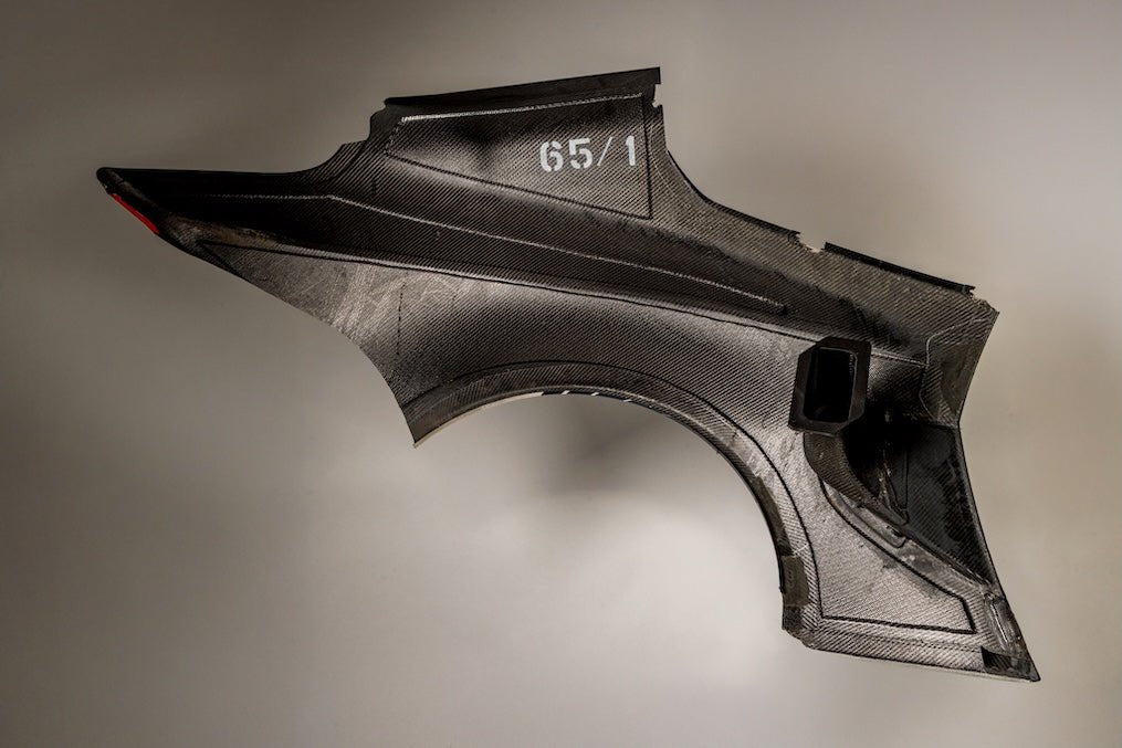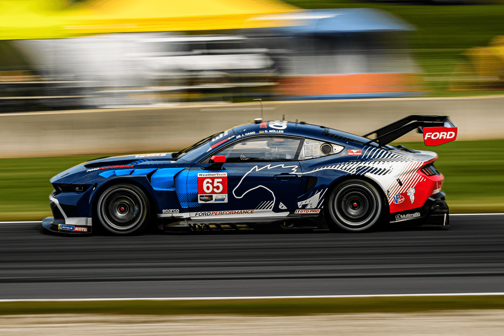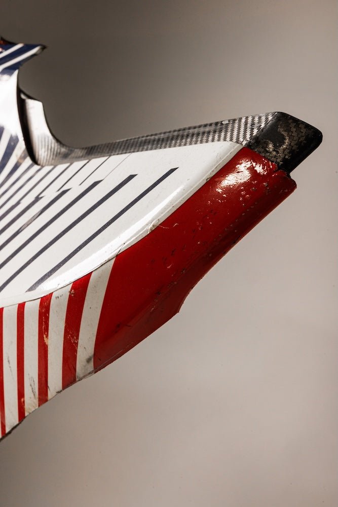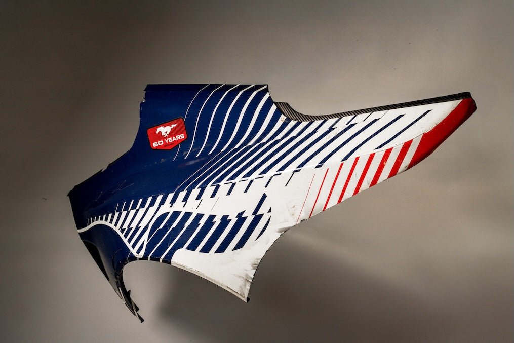 Direct from the track! This striking race-used #65 GT3 Mustang 1/4 panel showcases the distinctive Red, White, & Blue livery and Ford pony graphic. Bearing the marks of competition and authenticated with the personal signature of driver Joey Hand, it's a tangible piece of GT3 action.