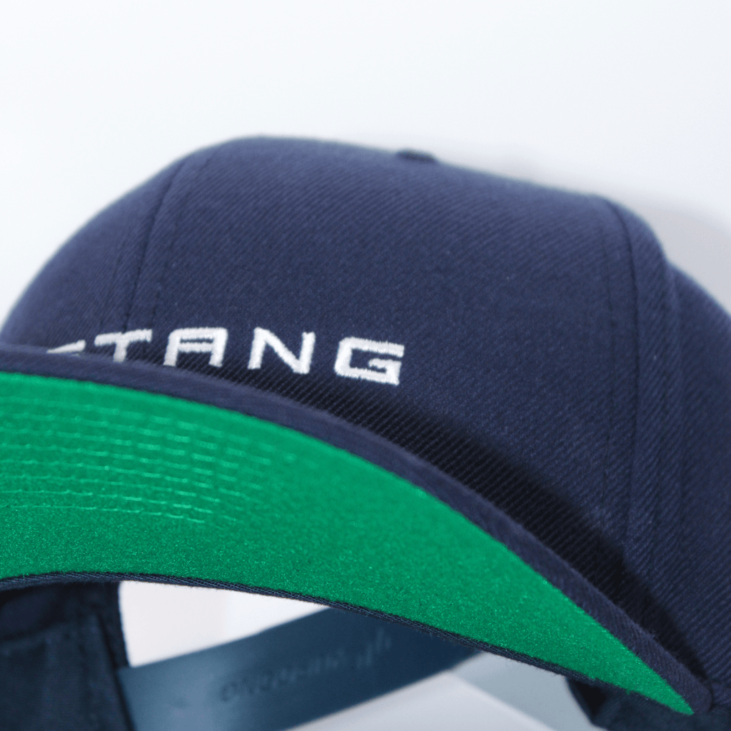 Capture classic street style and automotive heritage with this officially Ford licensed Mustang Script Logo Snapback Hat. This premium navy blue snapback is built on the authentic Yupoong base, featuring bold white Mustang script embroidery across the front for unmistakable visibility.