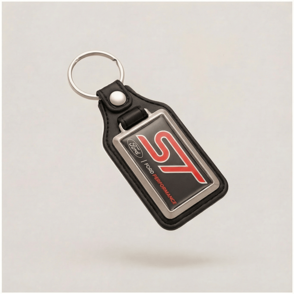 Description: Ford Performance ST Keychain Rectangle Keychain w/Black Leather Back Printed rectangle keychain with faux leather back. Manufactured from high-quality metal. Logo printed onto insert behind transparent window. Features premium chrome plating, dome accent, and a matching key ring for easy attachment. Size: 3" x 1.5"