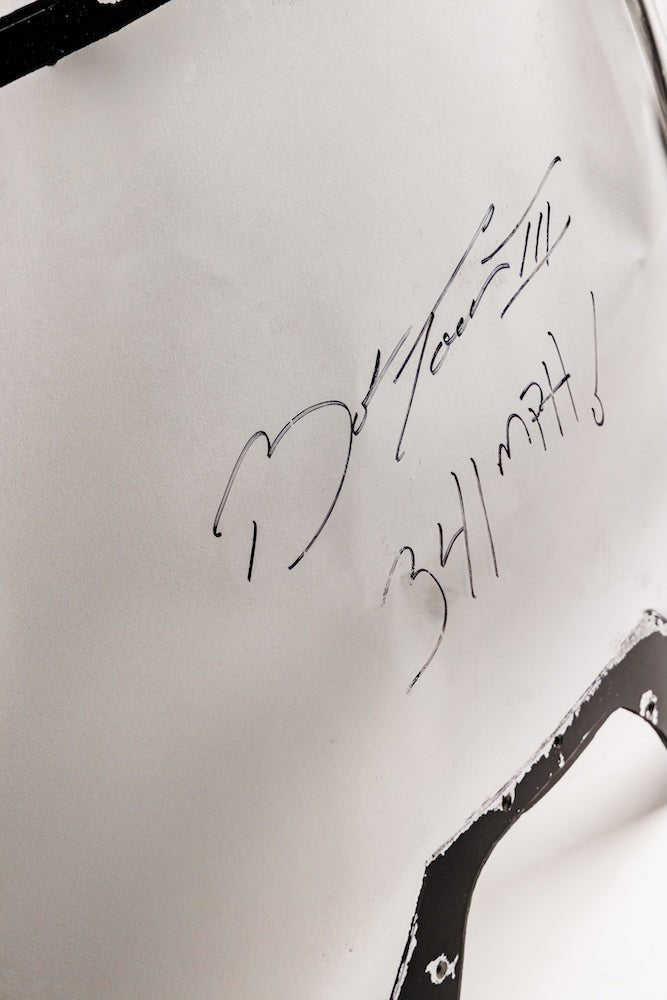 This genuine front windshield was part of a Ford Performance Nitro Funny Car piloted by Bob Tasca III. A true testament to the Tasca family's drag racing legacy, this incredible piece is further authenticated by the personal signature of Bob Tasca III. A must-have for drag racing enthusiasts.